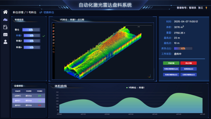 2.数据处理: 系统自动过滤掉环境干扰(如过往铲车、支撑结构),提取纯净的料堆点云。